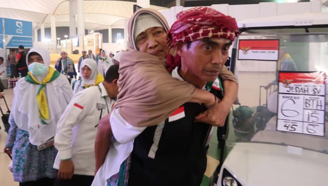 TIMES Madura/Petugas PPIH menggendong jemaah risti di bandara KAIA Jeddah, jelang pulang ke tanah air. (FOTO : istimewa).